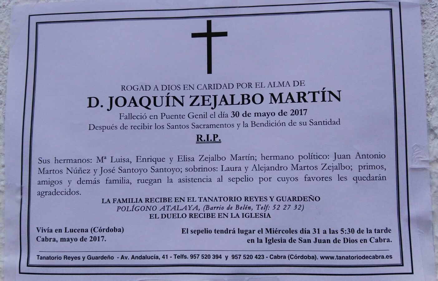 El Funeral tendrá lugar en la Iglesia de San Juan de Dios de Cabra (Córdoba), mañana miércoles 31 de mayo de 2017, a las 17:30 horas.