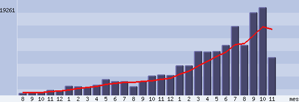 Por primera vez en los dos años de vida de esta página se ha sobrepasado la barrera simbólica de las 1.000 visitas en un solo día. Sucedió el pasado martes día 12 de noviembre y se repitió el miércoles 13 con 1.010. En estos momentos se están trasmitiendo alrededor de 1.200 Mw. de información mensual, en un 80%, texto lo que viene a ser equivalente a unos 120 ejemplares de El Quijote, es decir, unos 4 al día. El cuadro adjunto denota la evolución ascendiente de las visitas medida por meses: