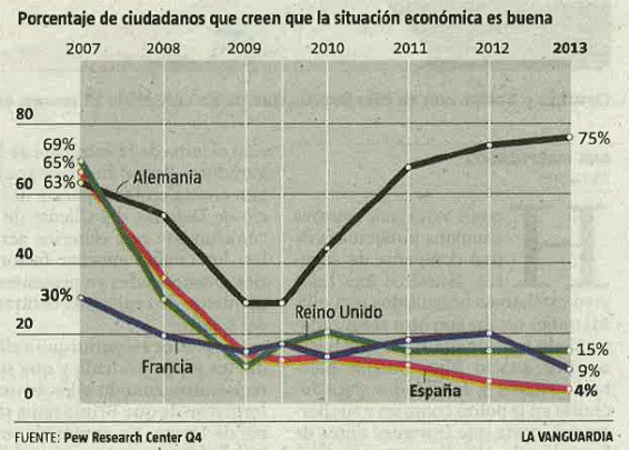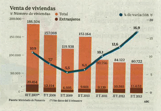 Hace más de un año, publicamos un artículo sobre el futuro del sector de la construcción dentro de la serie ¿Y SI ESTUVIÉRAMOS SALIENDO DE LA CRISIS? , NÚMERO 2 y del que entresacamos la siguiente predicción: “Creo que, este sector, es victima de un análisis y de un tratamiento público y financiero manifiestamente mejorable. Al sector de la construcción en España no se le puede tratar como al de otros países que sufrieron otra burbuja inmobiliaria (eje. Irlanda) ya que tiene otras perspectivas de futuro, más positivas. El sector inmobiliario lo dividiría en 2 zonas, la A y La A, agruparía los inmuebles que, además de la demanda interior, tiene interés para los compradores exteriores, se podría llamar “zona de exportación”. Son espacios geográficos que tienen unas condiciones atractivas para los inversores internacionales, tanto para la jubilación o como residencia turística. Para estos últimos compradores, España ofrece unas condiciones excepcionales: un clima benigno, una oferta cultural, gastronómica y paisajística de alto nivel, seguridad personal y jurídica, es uno de los países más divertidos y entretenidos de Europa y cuenta con unas ciudades repartidas a lo largo de esta zona que permite al jubilado o turista cubrir sus necesidades personales con una atención de calidad como, por ejemplo, la asistencia sanitaria. La inversión inmobiliaria genera otros efectos económicos muy importantes, como el de ampliar el nivel de consumo local con la aportación de la renta de los nuevos residentes. La capacidad económica de los extranjeros será determinante para el futuro económico de los diferentes sectores empresariales de Por lo tanto, es previsible, que el interés exterior lo tendremos asegurado si no cambian las circunstancias y el actual stock de viviendas se acabará vendiendo, ya que es un producto muy competitivo para la inversión extranjera .Este stock está concentrado, en su mayor parte, en el eje mediterráneo (Baleares, Cataluña, Comunidad Valenciana, Murcia y Andalucía) y en otras zonas de interés internacional (como, por ejemplo, Madrid o Canarias).” (Aprovecho para recordaros que con el conjunto de artículos confeccioné un libro sobre el año 2013, fundamental por la inesperada y profunda recuperación económica y anímica de un país prácticamente desahuciado y que podéis descargaros en el último número de la serie). Vamos a ver como le ha ido este pasado año al sector inmobiliario de España. En el periódico EXPANSIÓN del día 8 de diciembre de 2013, Antonio Del Bosque Barbero e Ignacio García Queimadelos, publicaron en su siempre recomendable “Pulso Inmobiliario” el siguiente artículo “PRIMER SÍNTOMA DEL CAMBIO DE CICLO: LA ASIMETRÍA EN LA EVOLUCIÓN DE LOS PRECIOS”, en el que se incluían unas estadísticas por Comunidades coincidentes con las publicadas, con tanto revuelo social, por el INE pero más completas ya que abarcan casi todo el período del estallido de la burbuja inmobiliaria. Como podemos observar, el crecimiento de precios está especialmente centrado en A estos gráficos haría unas observaciones El de que, en general, todas las Comunidades tienen una zona A y una B, de manera que, a la vez, puede estar creciendo de precios un 5% la primera zona y la segunda decreciendo un 4% pero, si esta última tiene importante cantidad de transacciones, la media no reflejará la realidad del mercado. Sólo las que tienen porcentajes muy mayoritarios en una u otra zona, como puede ser el caso de las Baleares, la tendencia se verá más clara. Y como consecuencia de la mejora de los datos fundamentales de nuestra economía: reducción de los desequilibrios del sector público y exterior, saneamiento del sector financiero, incremento de la confianza internacional en la gestión política como consecuencia del programa de reformas destinado a la mejora de la competitividad del sector productivo, estabilización de la destrucción del empleo, retorno al crecimiento económico..., todo ello ha contribuido a la reducción de los costes financieros y al regreso del capital exterior a nuestra economía lo que ha provocado que se han sumado a los cualificados grupos de inversión internacional mencionados en el artículo referido al inicio, nuevos inversores exteriores y fondos internacionales que se han interesado por inmuebles tanto residenciales como no residenciales (oficinas, hoteles, centros comerciales...) Como, desde el año 2.007, la corrección de precios ha sido constante y profunda y lo mismo ha sucedido con su producción, es lógico que con un stock tan reducido la demanda esté generando un incremento de precios. Y eso que la demanda interna está paralizada por una depresión injustificable, como podéis comprobar en el gráfico (3) publicado en LA VANGUARDIA. ¿Como es posible que en el 2007, al inicio de su más grave crisis económica de los últimos decenios, los españoles estuvieran entre los más optimistas teniendo el futuro más negro y los peores datos en desequilibrio comercial, endeudamiento y deterioro de las finanzas públicas y actualmente, que todo ello se está corrigiendo de un modo tan radical y sorprendente y que los analistas y los prestamistas internacionales nos están concediendo un crédito que nos retiraron hace ya bastantes años, somos ahora y no en 2007, los más pesimistas? Algo debe fallar en nuestro sistema educativo, en la calidad e independencia de nuestros medios de información y en definitiva, en nuestra sociedad, para explicar semejante error de diagnóstico. Sin soberanía monetaria, el nivel de vida de los pueblos de Y no se podrá solucionar el problema del paro si no hay un marco fiscal, laboral, financiero y hasta un clima social que sea propicio para generar nuevos emprendedores ya que los anteriores difícilmente crearán más empleo cuando sus plantillas, en una recesión como la actual, están infrautilizadas. Y para que sean viables las empresas y