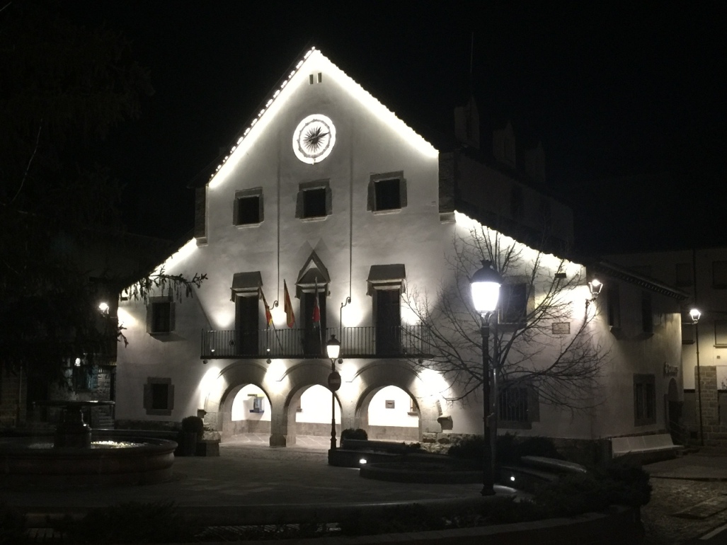 Ayuntamiento de Biescas (Huesca) iluminado. Realizado en la década de 1940 por un organismo dedicado a reparar zonas devastadas por la guerra civil.