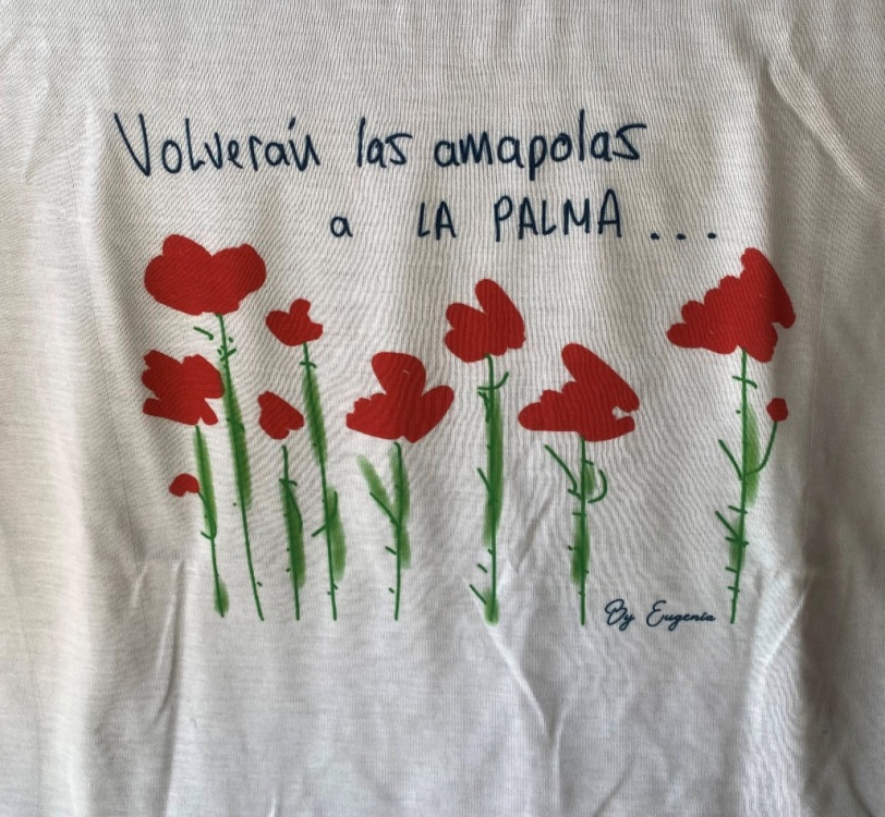 Antes de ir a la Palma, contacté con una diseñadora palmera de unas camisetas, Eugenia Pérez Curbelo, que puso en ellas el más hermoso y esperanzador mensaje que había leído: curiosamente es abogada en las Palmas y tuvo la generosidad de ir a verme y llevarme unas camisetas que no se pueden comprar todavía a distancia.