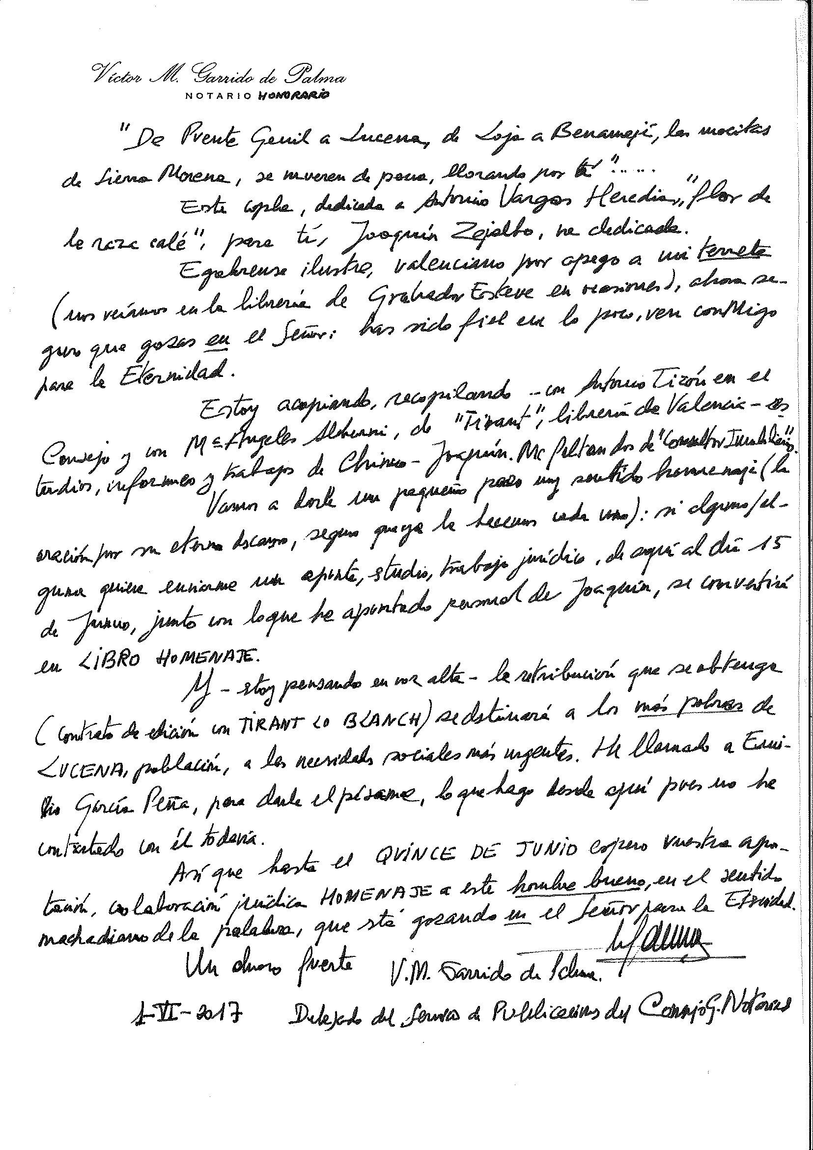 Carta manuscrita recibida de Víctor Garrido de Palma, Notario honorario.
