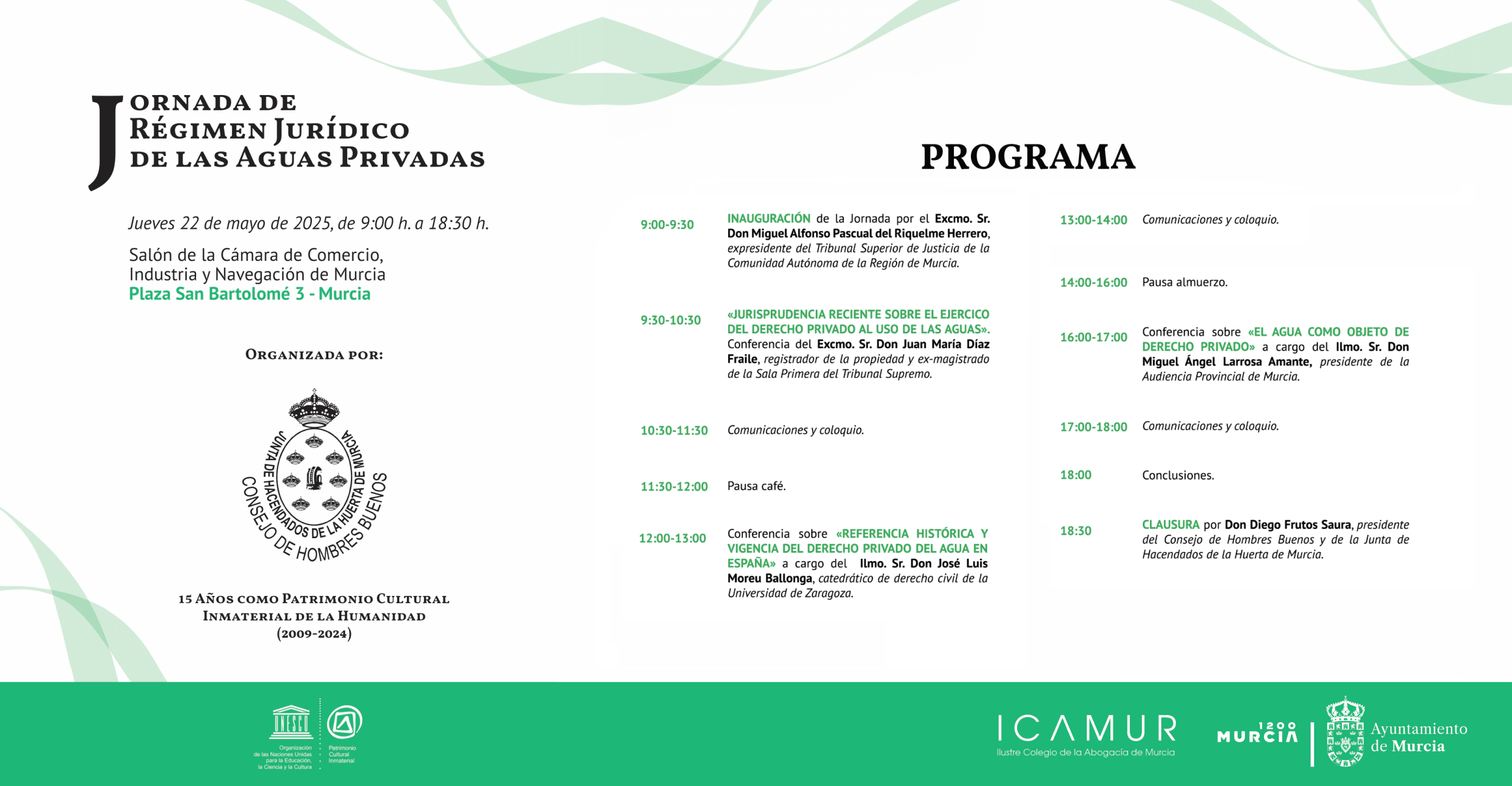 Con motivo del decimoquinto aniversario de su declaración como Patrimonio Cultural Inmaterial de la Humanidad por la UNESCO, el Consejo de Hombres Buenos de Murcia ha organizado la Jornada de Régimen Jurídico de las Aguas Privadas junto con la inestimable colaboración del Ilustre Colegio de la Abogacía de Murcia .