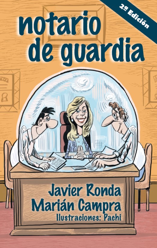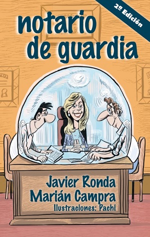 Peleas por una máquina de coser en una herencia millonaria, vivos que se hacen pasar por muertos en un testamento y esconden al difunto, un testamento donde aparece un gato, urnas funerarias en una hipoteca de un piso, bodas góticas en una notaría o en un balneario, bebés llorones pero que se duermen con la lectura de una escritura de una compra de una vivienda, todo es posible en Notario de Guardia, la primera obra española de anécdotas sobre notarías. El libro contiene una decena de viñetas, más la portada, del conocido viñetista Pachi (Sur de Málaga).