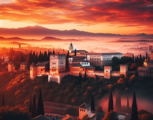 Recreación de la Alhambra de Granada al atardecer. Elaborada por inteligencia artificial: GPT-4 y Dall-e 3.