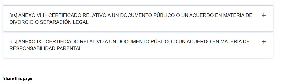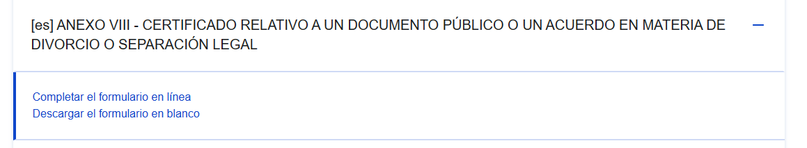 A mí, Notario, para que expida y le entregue el CERTIFICADO RELATIVO A UN DOCUMENTO PÚBLICO EN MATERIA DE DIVORCIO contenido en el ANEXO VIII del Reglamento (UE) 2019/1111 del Consejo **y me solicita que el Anexo se expida, además de en el idioma en que está expedida la resolución de divorcio (español) en idioma *alemán*, según permite la propia página del Portal Europeo de Justicia, por lo que editaré el mismo certificado desde dicha página en español y lo generaré en *ambos idiomas: español y alemán* alemán* español*