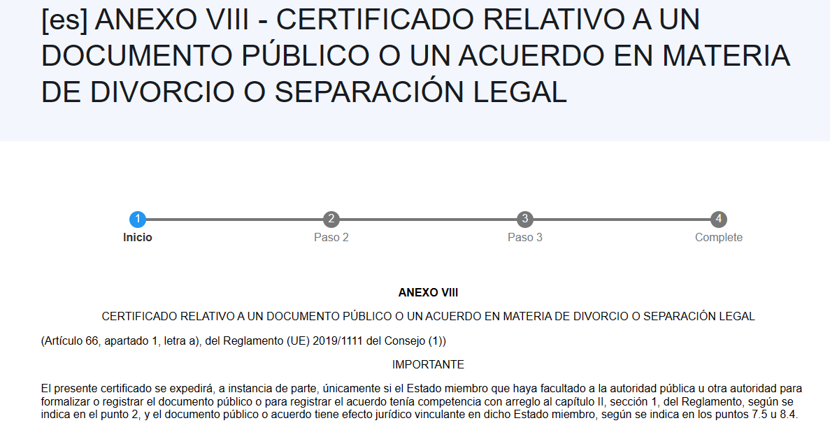 Que la parte requirente está interesada en que se le expida el CERTIFICADO RELATIVO A UN DOCUMENTO PÚBLICO EN MATERIA DE DIVORCIO previsto en el artículo 66, apartado 1, letra a), del Reglamento (UE) 2019/1111 del Consejo, contenido en el ANEXO VIII, para la inscripción de la presente escritura en el Registro Civil de * con el objeto de actualizar los datos del Registro Civil.