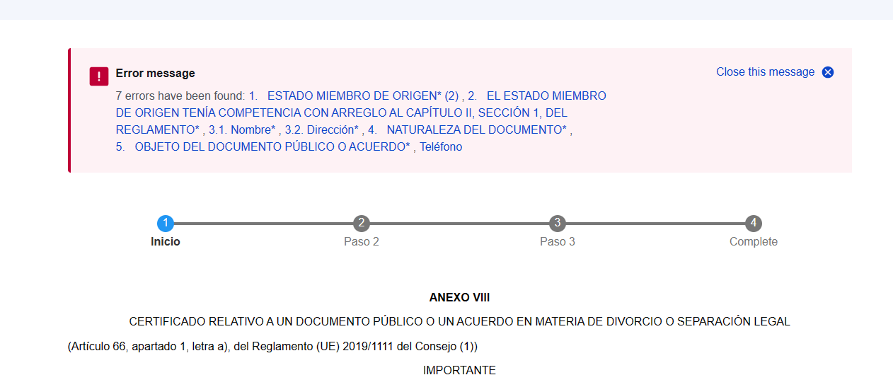 Parece que debe ser posible, si el requirente solicita el Certificado en el idioma oficial del país donde se va a utilizar, generarlo en ese idioma o generarlo dos veces, una en español y otra en el idioma solicitado, dejando constancia de ambas versiones, por testimonio, en el acta de requerimiento. Generarlo dos veces no significa emitir dos certificados, sino que, como después se verá, una vez introducidos todos los datos, en la última pantalla, el botón de «“crear el formulario en PDF» permite crearlo en varios idiomas, es decir, obtener un PDF del mismo certificado en distintos idiomas.