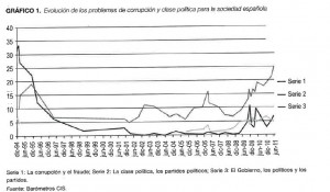 En un artículo posterior “Cuando despertó la corrupción todavía estaba allí”, ratifica el tratamiento selectivo de la corrupción en la prensa, ampliándolo y adaptándolo a un periodo posterior (2013 vs abril de 2014), pero hay un tema que me ha merecido interés :el de la correspondencia entre el tratamiento informativo y la percepción de la corrupción como problema y llega a la conclusión “ que se puede apreciar una cierta correlación (que no es casualidad) entre la cobertura en las portadas y la percepción de la corrupción como problema, al menos hasta julio de 2013”.