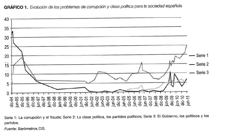El Instituto de Economía de Barcelona de la Universidad de Barcelona, elaboró un trabajo sobre este tema, “La percepción de la corrupción en España sube 10 puntos durante la crisis” (actualizado el 16 de junio de 2015) .El estudio asegura que “ la crisis no ha hecho aumentar la corrupción, sino que le ha dado visibilidad..” y recuerda que, según el CIS, un 50% de la población considera que la corrupción es uno de los tres principales problemas del país mientras que hasta octubre de 2.009, sólo el 1% percibía la corrupción como un problema. El informe advierte sobre el fenómeno de desafección política que causa la alta percepción de la corrupción y asegura que los alcaldes implicados en casos de corrupción sufren una pérdida media de entre el 4% y el 6% de sus votos , un porcentaje que crece hasta un 14’5% , cuando hay cobertura mediática.