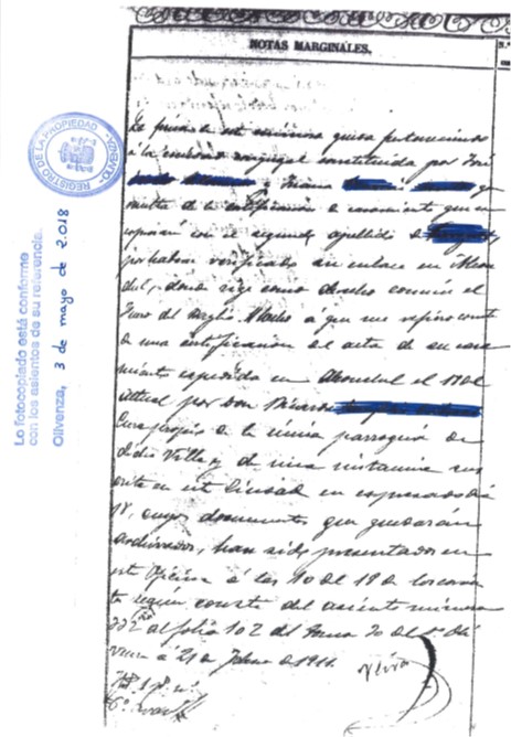 [35] Nota marginal sobre la inscripción 2ª de la finca registral número 14 del término de Alconchel (Badajoz), al Tomo 3, Libro 1, Folio 14, inscrita en el Registro de la Propiedad de Olivenza correspondiente al artículo 130 del Reglamento Hipotecario de 1861 en la que se hacía constar “La finca de este número queda perteneciendo a la sociedad conyugal constituida por José…… y Juana…… por haber verificado el enlace en Alconchel, donde rige como derecho común el Fuero del Baylío…..”