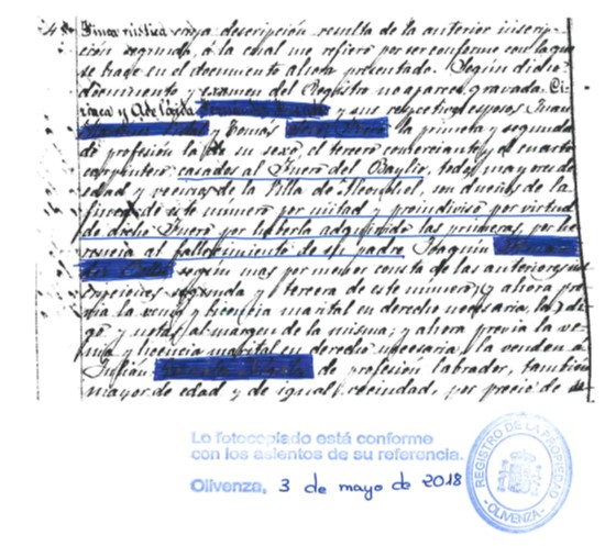 [37] Inscripción 4ª de la finca registral número 23 del término de Alconchel (Badajoz), al Tomo 3, Libro 1, Folio 120 anverso, inscrita en el Registro de la Propiedad de Olivenza correspondiente a una inscripción de transmisión realizada por dos mujeres como titulares por mitad y proindiviso constando que estaban casadas en Fuero del Baylío y donde se hace constar que comparecen los cónyuges “son dueños de la finca de este número por mitad y proindiviso por virtud de dicho Fuero por haberla adquirido las primeras por herencia al fallecimiento de su padre Joaquín….y ahora previa la venia y licencia marital en derecho necesaria, la venden a….”. El año de inscripción es 1893