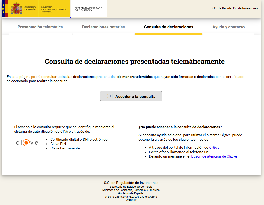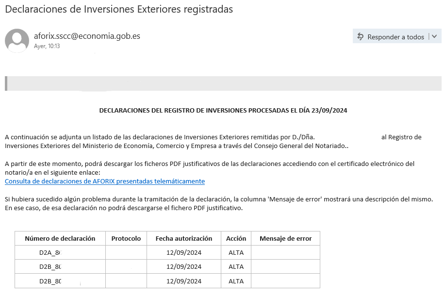 A continuación se adjunta un listado de las declaraciones de Inversiones Exteriores remitidas por D./Dña. *** al Registro de Inversiones Exteriores del Ministerio de Economía, Comercio y Empresa a través del Consejo General del Notariado. A partir de este momento, podrá descargar los ficheros PDF justificativos de las declaraciones accediendo con el certificado electrónico del notario/a en el siguiente enlace: