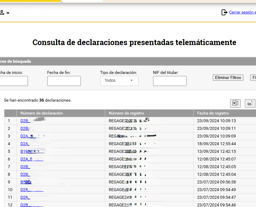 Una vez identificados con la tarjeta de notario tenemos acceso a todas las comunicaciones realizadas. Las podremos filtrar por fechas, por tipo de declaración o por NIF del titular.