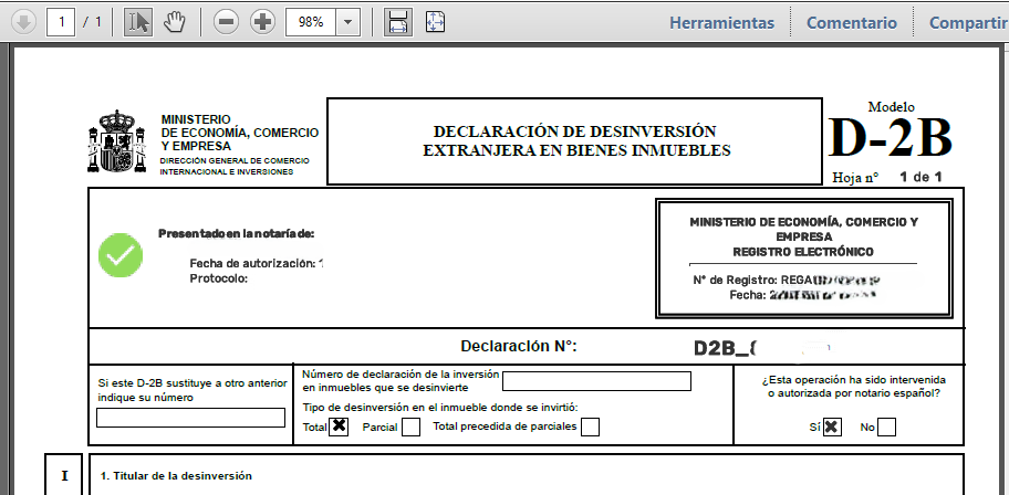 b).- Que con fecha * incorporo a la presente la impresión a papel del documento PDF acreditativo de la presentación y del número de registro de las Declaraciones de Inversiones Exteriores a que se refiere la presente escritura.