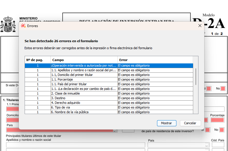 Para subsanar el error o completar la omisión podemos pinchar en “mostrar” o en “cancelar”, en ambos casos nos lleva a las casillas en rojo donde debemos ir rellenando/corrigiendo.