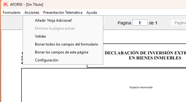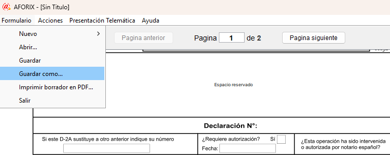 Para guardar, buscamos en la parte de arriba de la aplicación la pestaña «Acciones» y se despliegan varias opciones (nuevo, abrir, guardar, guardar como…), Pinchamos en «guardar» o en «guardar como» y nos preguntará por la carpeta donde queramos guardarlo. Lo ideal es guardarlo en una carpeta del expediente de la escritura que se firmará, porque así lo tendremos localizado. En este momento debemos guardar el formulario respetando el formato Aforix, es decir no debemos convertirlo en PDF ni en otro formato, porque se trata de poder rescatarlo cuando queramos desde la pestaña «Abrir» del desplegable que se abre al pinchar en «Acciones» y completar los datos que nos falten.