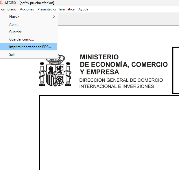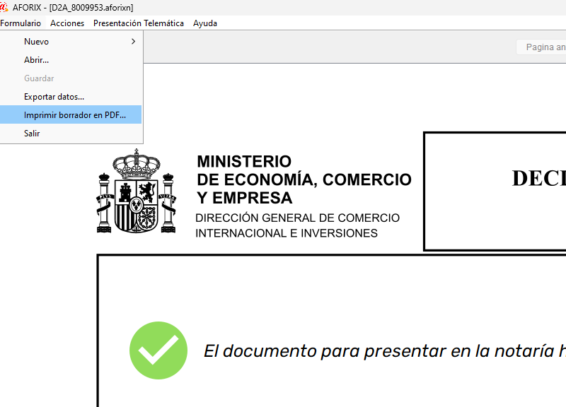 Abrimos el modelo desde la carpeta de expedientes (o desde Aforix en “abrir”) y en la pestaña “formulario” pinchamos en “imprimir borrador en PDF”