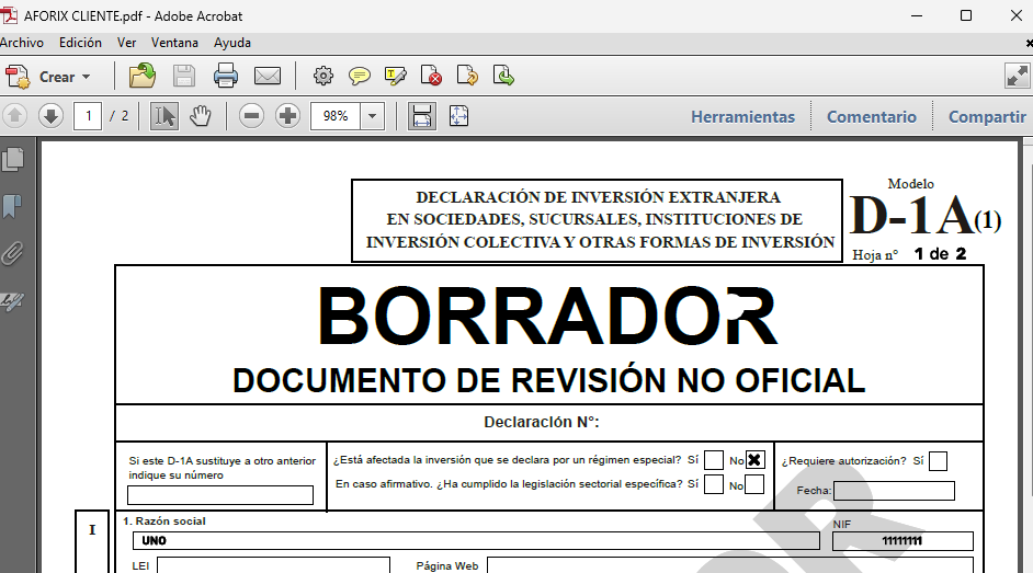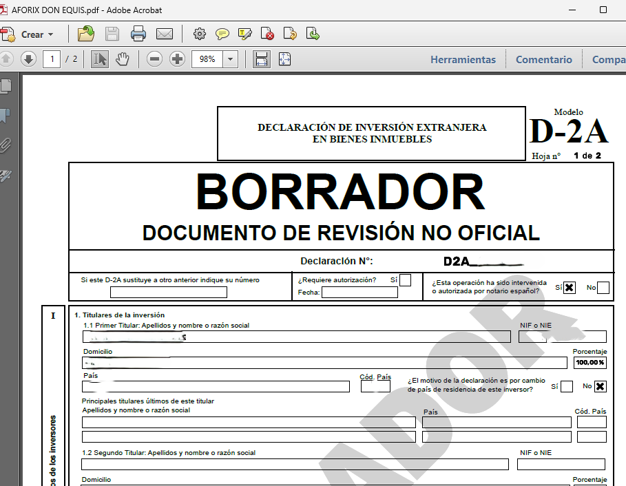 Este es el aspecto del borrador PDF que debemos guardar entre la demás documentación del expediente e imprimir en papel para incorporar a la matriz.