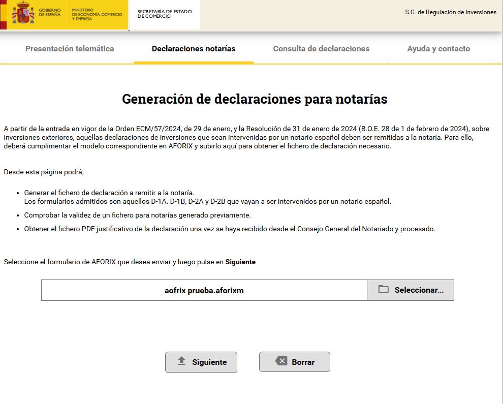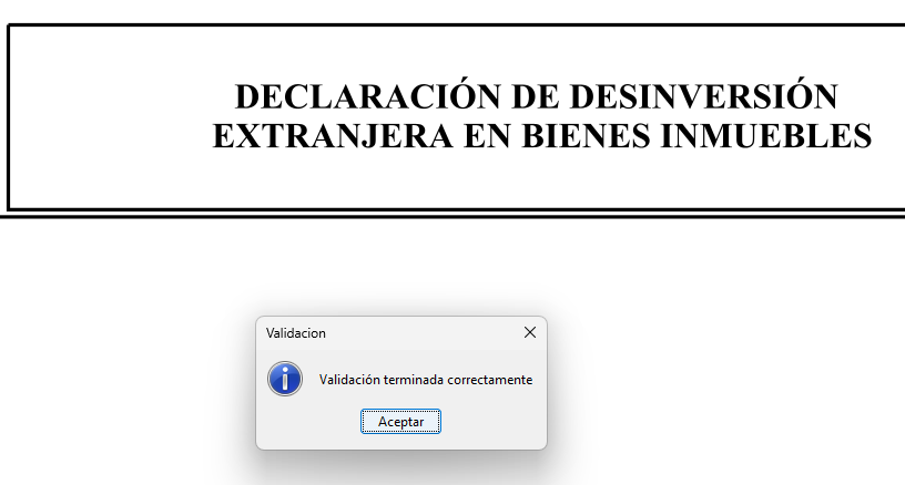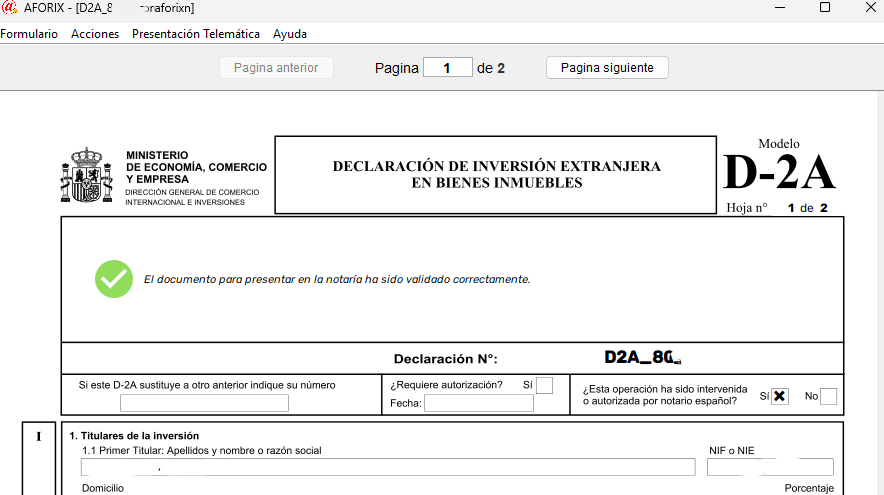 La página nos devuelve, en la misma casilla, el Formulario “validado correctamente” que es el que nos interesa y que ya tiene un número de declaración que es el que debemos hacer constar en la escritura (esos códigos alfanuméricos que aparecen en negrita en los modelos de párrafo proporcionados en el SIC, para los modelos buscar en SIC: Anexo III Modelos cláusulas inversiones exteriores)