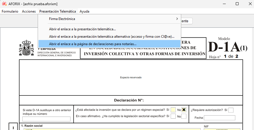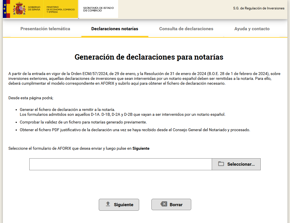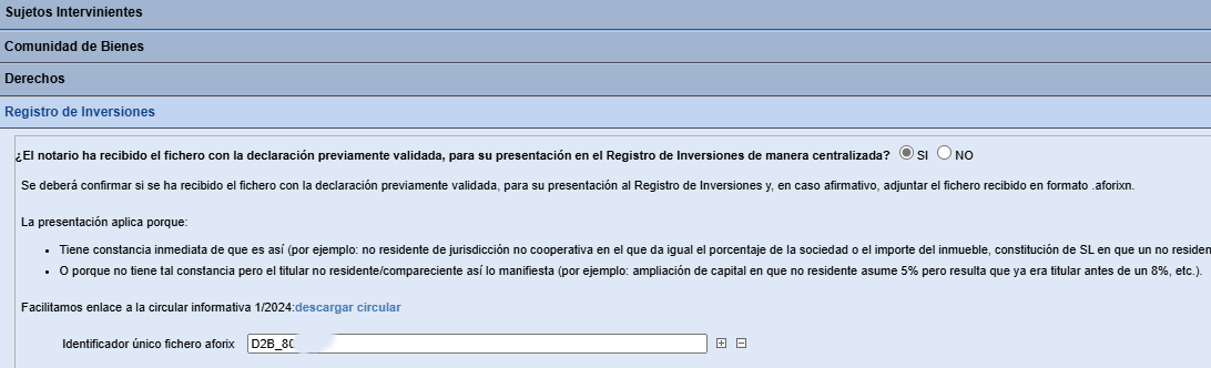 Pinchando en esa pestaña, se abre el desplegable en el que solo hay que responder si o no y, en caso afirmativo, hay que incorporar el modelo de la declaración de inversión en formato AFORIX que habremos guardado en el expediente.