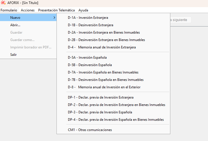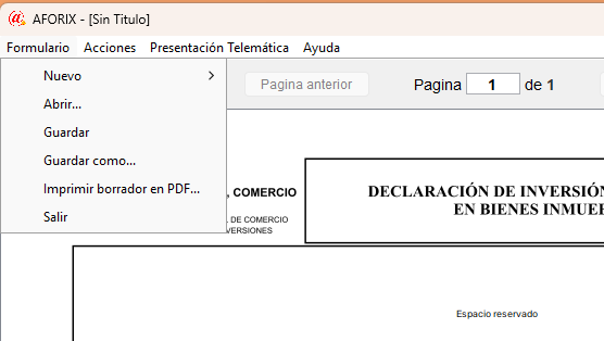Clicando en las palabras “formulario” aparece un desplegable con varias opciones (Nuevo, Abrir, Guardar, etc). Manteniendo el cursor del ratón sobre “Nuevo” aparece otro desplegable con todos los modelos de declaraciones y una pequeña leyenda de la función de cada uno.