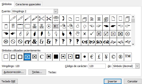 .- Ir a Insertar/Símbolo y seleccionar el deseado, normalmente el 120 (cuadrado con cruz), pero pueden valer también el 169 (cuadrado con cuadradito negro),o el 162 (cuadrado todo negro).