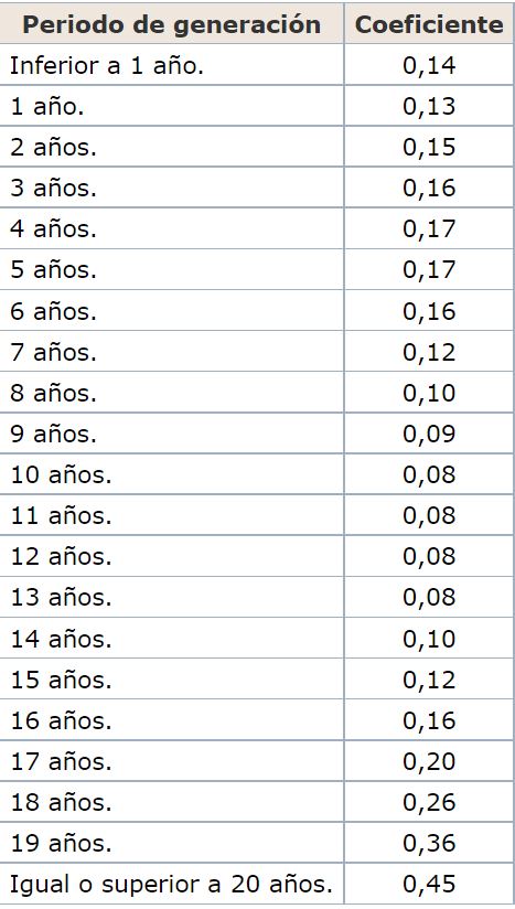 La nueva Tabla de coeficientes es la siguiente: