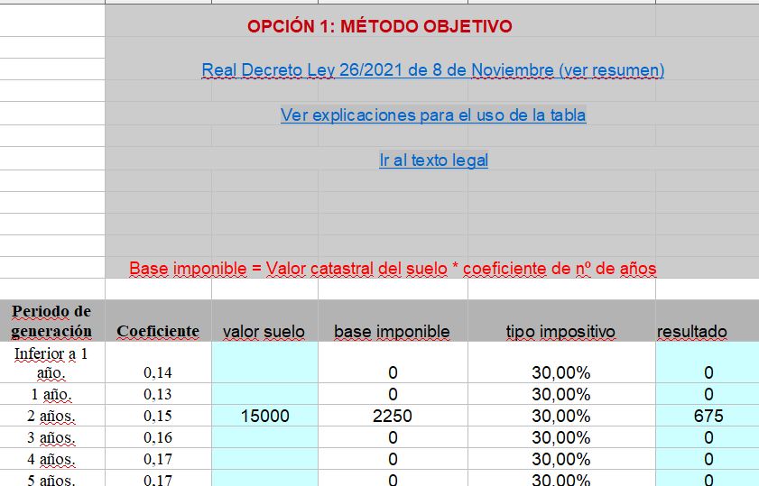 Se parte del valor catastral del suelo y se obtiene aplicando a dicho valor la nueva Tabla de coeficientes, aprobada por el citado Real Decreto Ley, que nos da la base imponible a la que se le aplica el tipo impositivo del 30% .