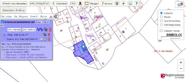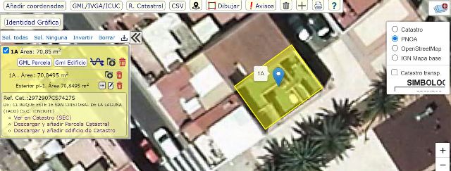 Se aporta para ello complementariamente a la escritura un Informe de Validación Gráfica (IVG) para el suelo y, o bien un listado en papel del las coordenadas de la superficie ocupada por la edificación, o bien un Informe Catastral de Ubicación de las Construcciones (ICUC) , que son coincidentes. Si no tenemos una herramienta adecuada para leer el archivo GML tenemos que suponer que tiene la misma medida (de superficie ocupada y del solar) que la expresada en el Certificado literario, al provenir del mismo técnico.