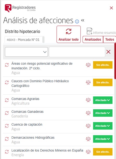 La herramienta contextos (aparece como un libro abierto) nos da un catálogo de afecciones (inundación, dominio público, espacios naturales protegidos, etc). Se puede seleccionar el ámbito que se quiere analizar o directamente solicitar un análisis de todo.