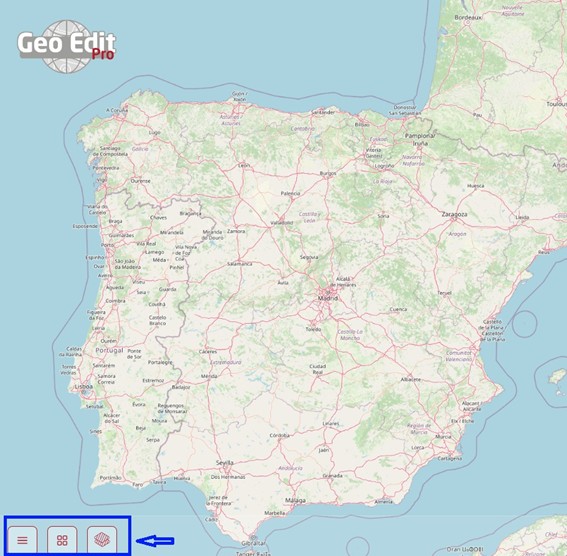 En la aplicación GEOEDIT PRO hay tres menús: Menú principal. Menú fichas. Ajuste de capas. Se encuentran en la parte de abajo de la pantalla.