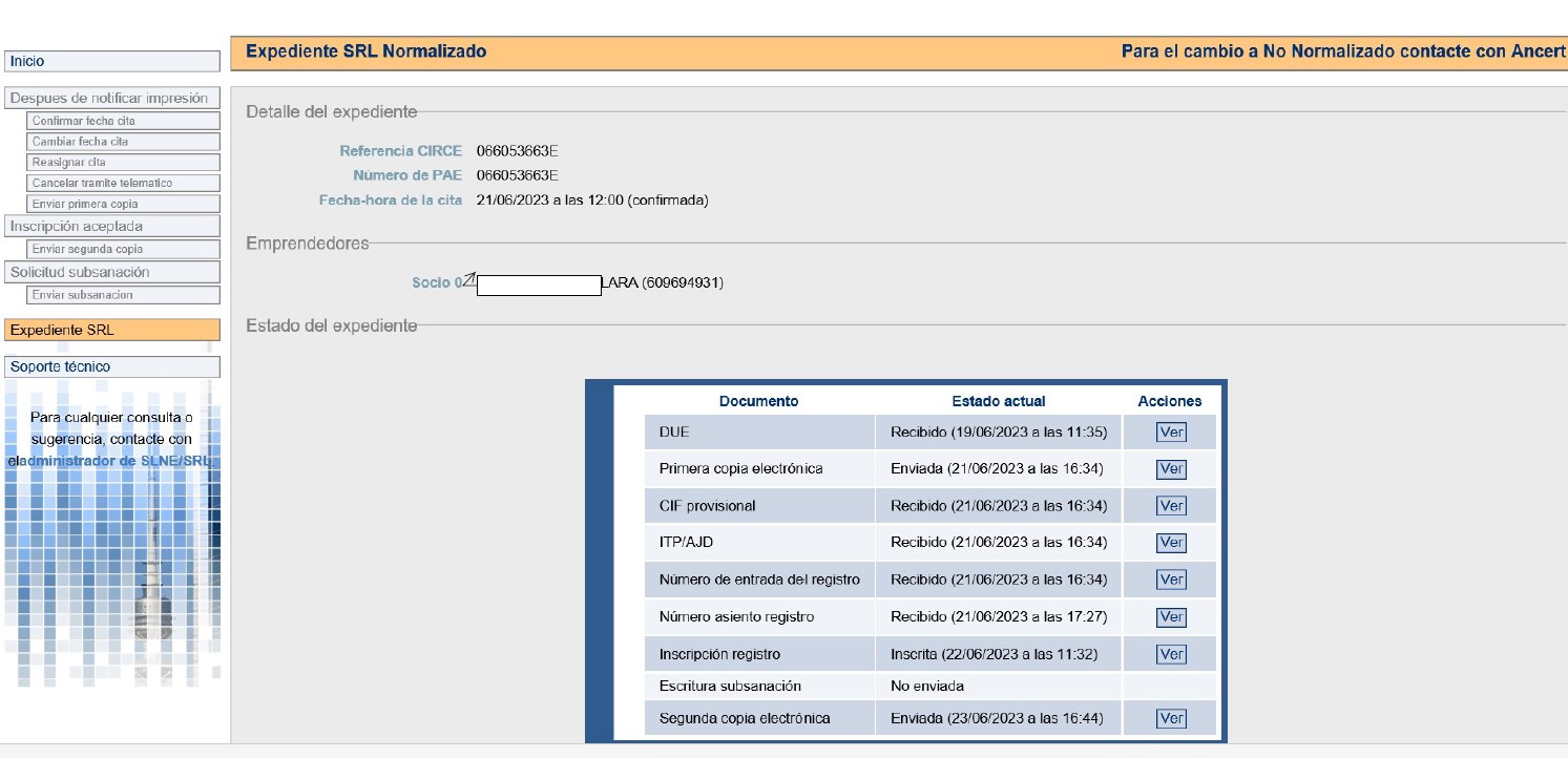 11ª pantalla: Una vez enviada la copia al Registro Mercantil se puede ver el historial de los documentos que van llegando: CIF provisional +liquidación impuesto OS + datos de entrada e Inscripción en el Registro Mercantil