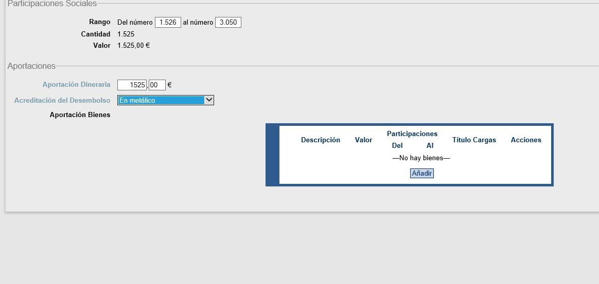 6ª pantalla: Datos de las aportaciones sociales dinerarias y en su caso de las no dinerarias