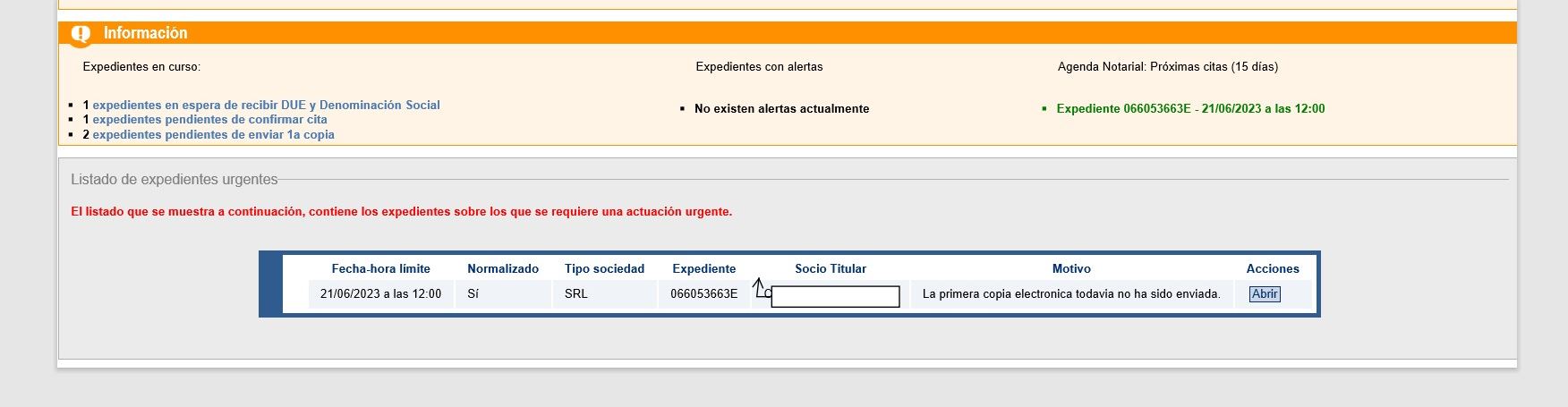 9ª pantalla: antes de enviar la 1ª copia al Registro Mercantil, el sistema avisa de los datos básicos de la sociedad, a modo de repaso, por si hubiera algo que corregir