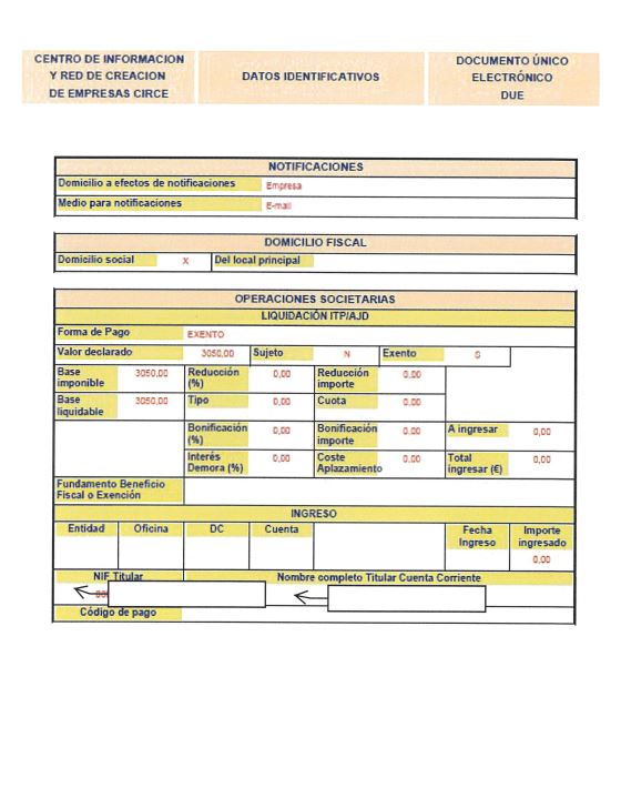El D.U.E. o Documento Único Electrónico, que es un documento en formato electrónico que contiene todos los campos variables de la nueva sociedad necesarios para el otorgamiento de la escritura de constitución y para los organismo tributarios y de la seguridad social.