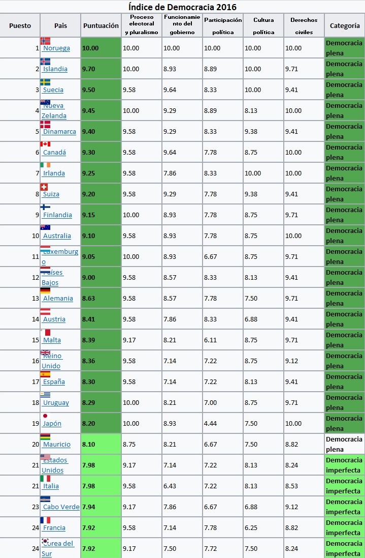 El índice británico de clasificación mundial del 2016 “Democracy Index 2016”,* reparte los países en grandes grupos: Democracia plena (1/20), Democracia imperfecta (21/76), Régimen híbrido (77/116) y Régimen autoritario (117/167). La clasificación sitúa a España en el puesto 17º del ranking mundial de calidad democrática, por delante de EEUU, Italia y Francia. España está integrada en el grupo (solo 20) de Democracia plena. Están situados en el grupo de Régimen autoritario: Venezuela en el 117, Cuba en el 128 y Corea del Norte, el último en el 167.