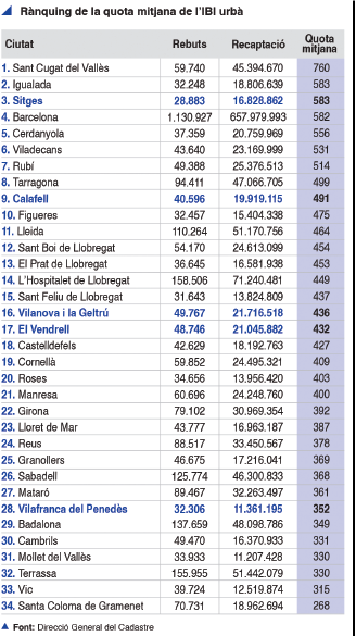 En el número correspondiente al mes de enero del PENEDÈS ECONÓMIC, donde publico los artículos en catalán, hay una página dedicada al ranking de la cuota media del IBI urbano de los ayuntamientos de Cataluña que ha provocado un gran interés ciudadano. A primera vista, llama la atención como Ayuntamientos de pueblos, en apariencia similares, como Igualada y Vic o Calafell y Cambrils, tengan una tributación tan diferente.