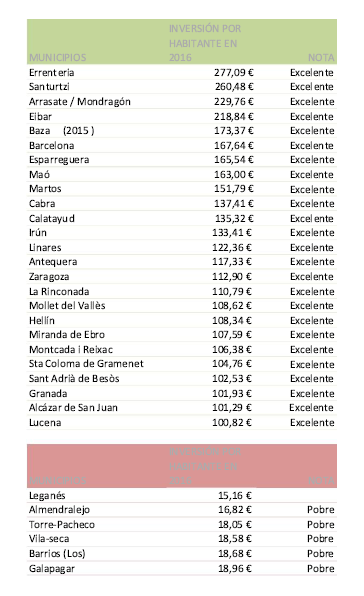 El 30 de noviembre de 2017, EL PAIS, publicó un interesante artículo de Gloria Rodríguez Pina “Los municipios que más invierten en servicios sociales (y los que menos)” En él se recoge el análisis de la Asociación de Directoras y Gerentes de Servicios Sociales de España sobre la inversión de los municipios de España de más de 20.000 habitantes en servicios sociales, en relación con su presupuesto municipal en 2016.